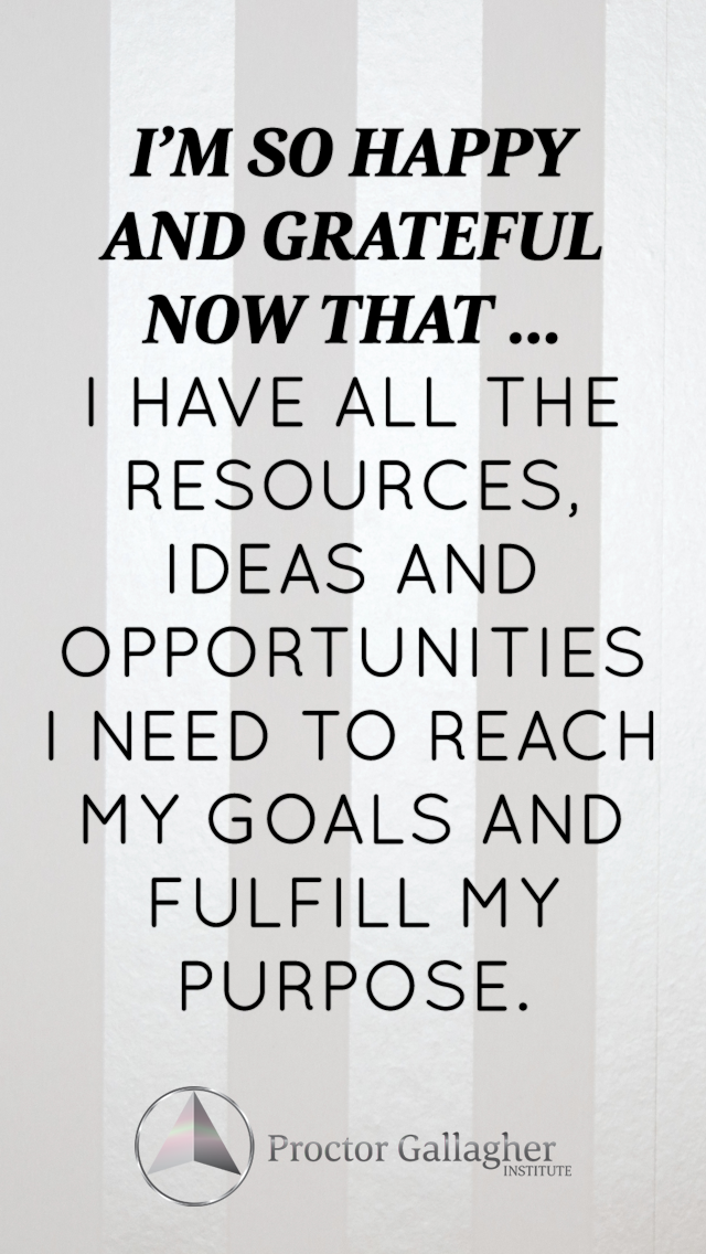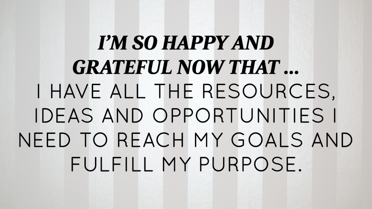 I’m so happy and grateful now that … I have all the resources, ideas and opportunities I need to reach my goals and fulfill my purpose.
